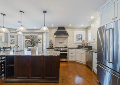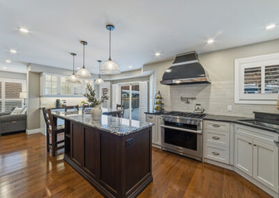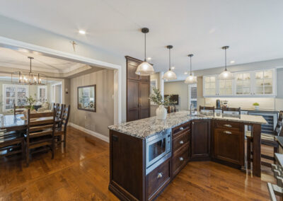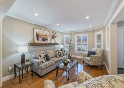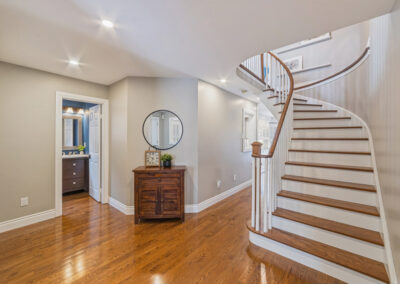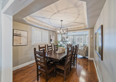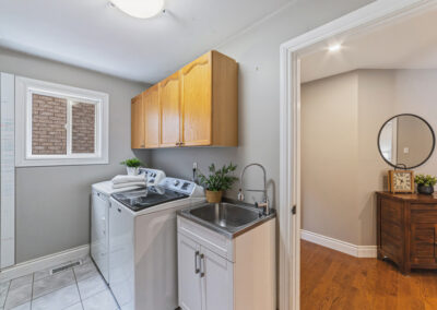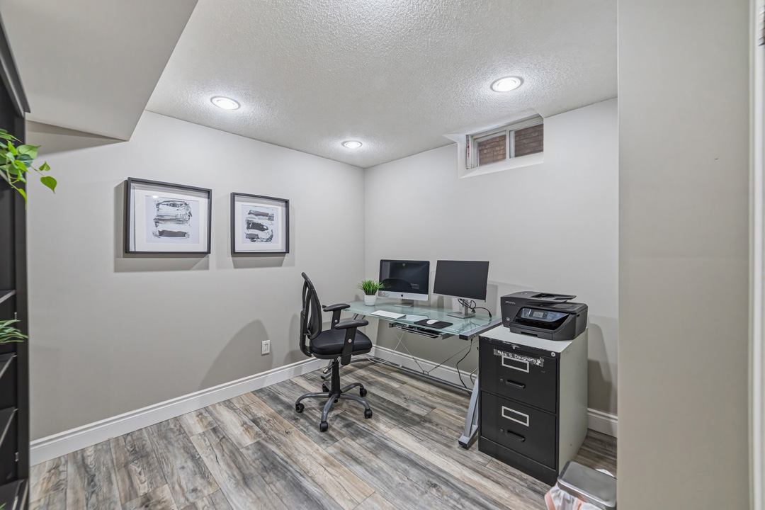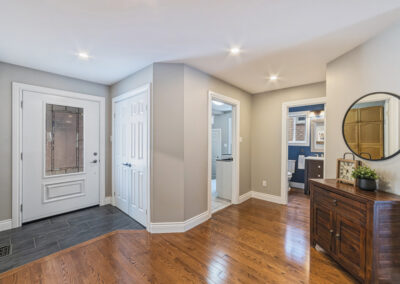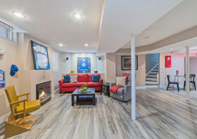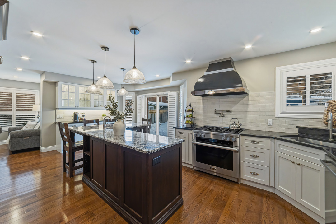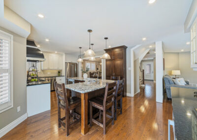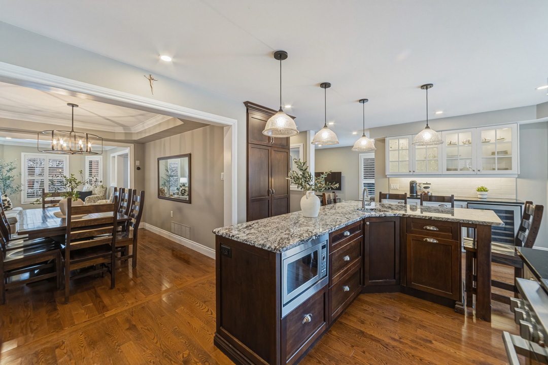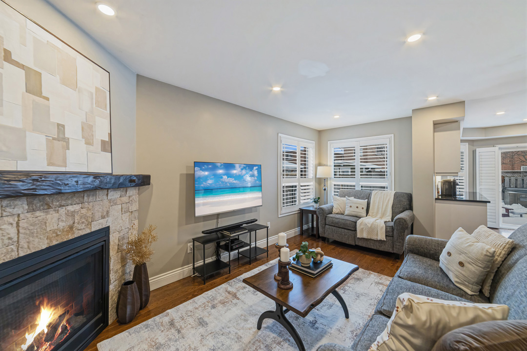 The main floor was completely redesigned in 2017, showcasing seamless hardwood flooring and a custom chef’s kitchen that anchors the home. Featuring granite countertops, an oversized centre island, built-in beverage station, and professional-grade appliances—including a Miele gas stove with steam oven—this space was built for both entertaining and everyday luxury. The open-concept layout flows into a warm family room with fireplace, while a functional mudroom offers garage access and a rare second staircase to the lower level.