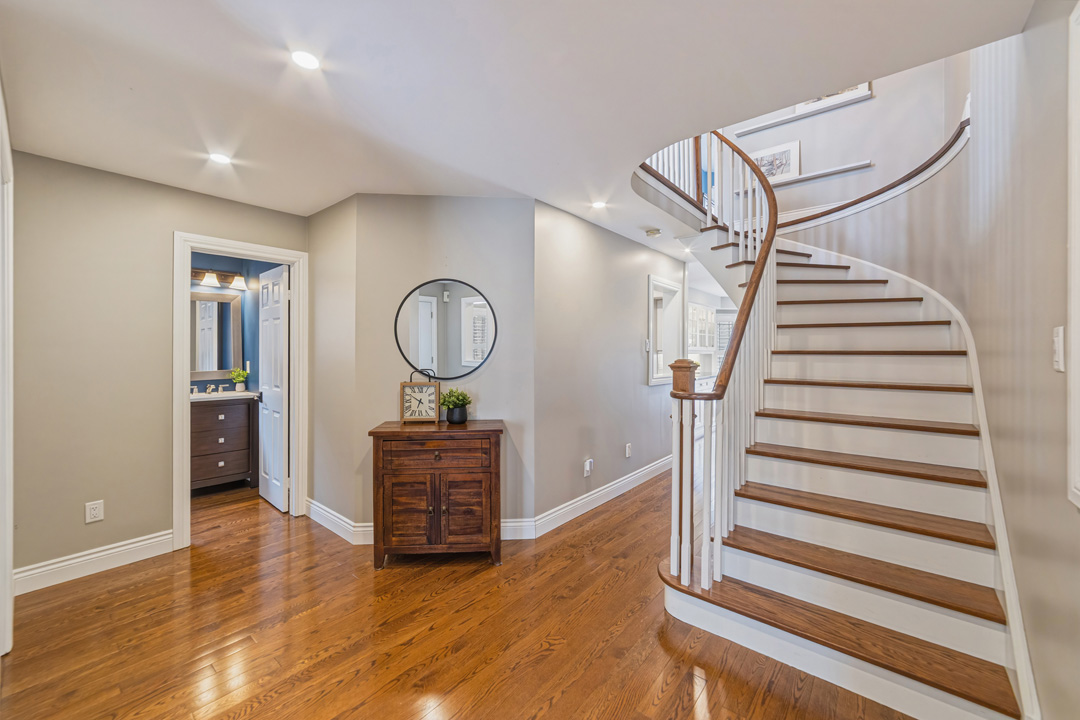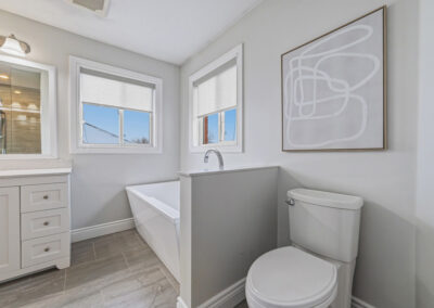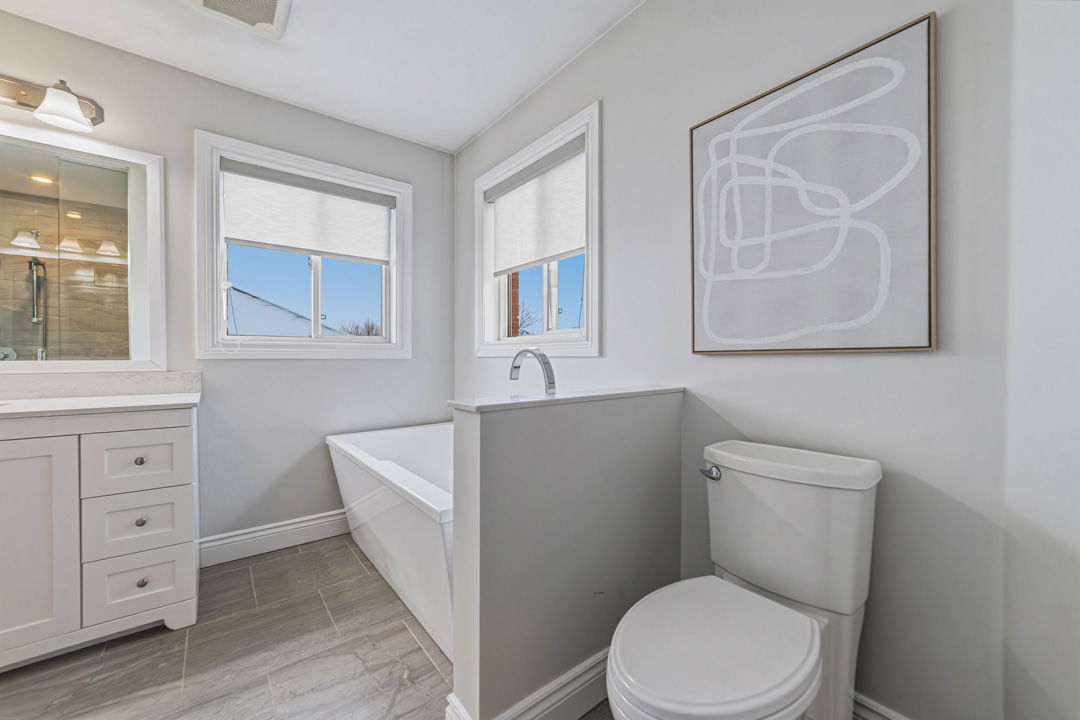 Upstairs, hardwood flooring continues throughout four spacious bedrooms. The reimagined primary retreat includes a walk-in closet reconfiguration, sitting area, and a spa-inspired ensuite (2017) complete with freestanding soaker tub and oversized glass shower.