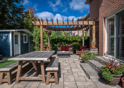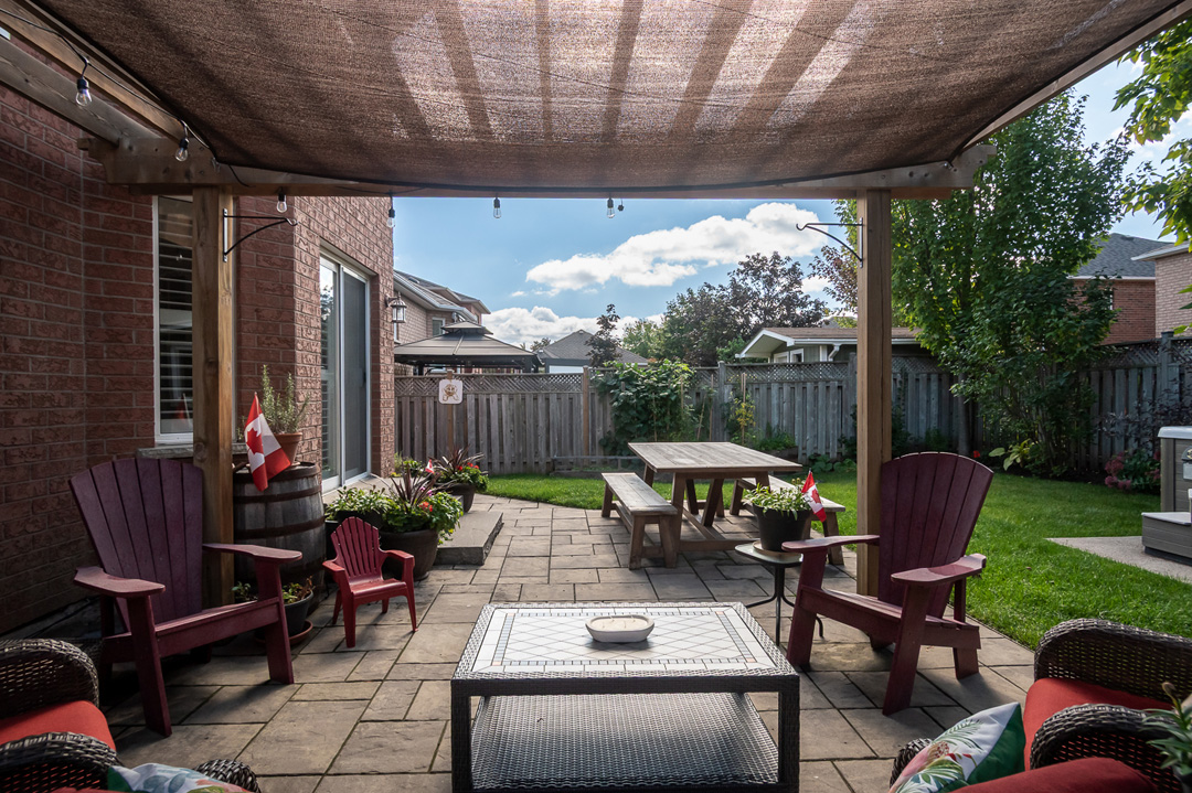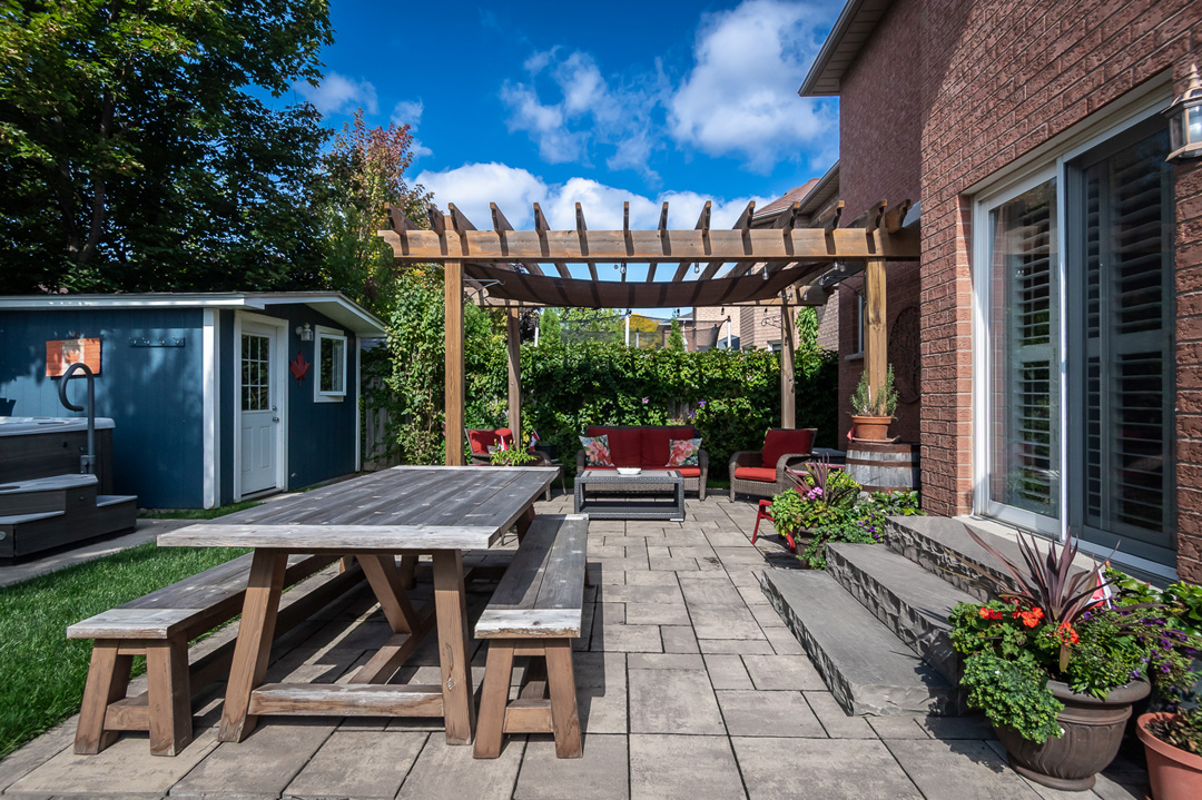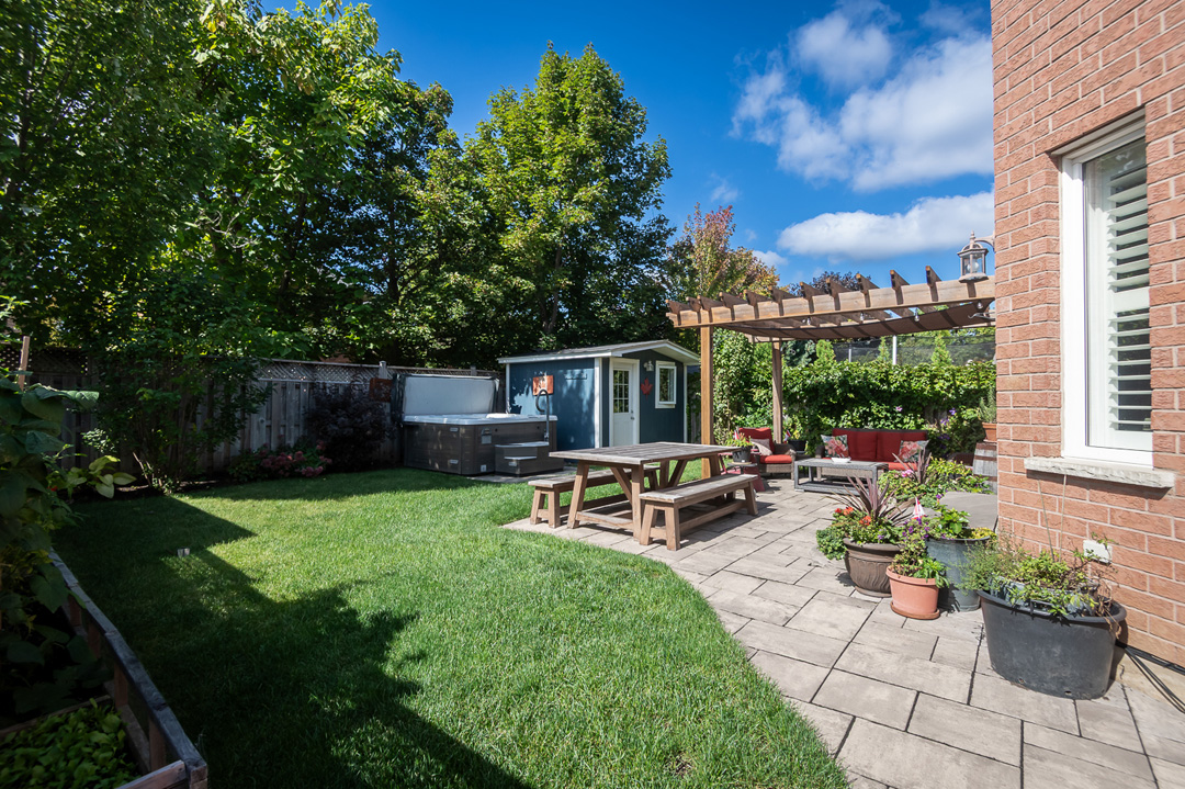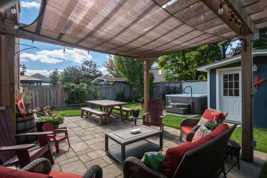 Major updates include roof (2017), furnace (2017), and A/C (2018). Step outside to a professionally landscaped backyard oasis with mature trees, interlocking patio, pergola, wooden shed with hydro, and large Beachcomber hot tub (2020) —perfect for relaxing or hosting.